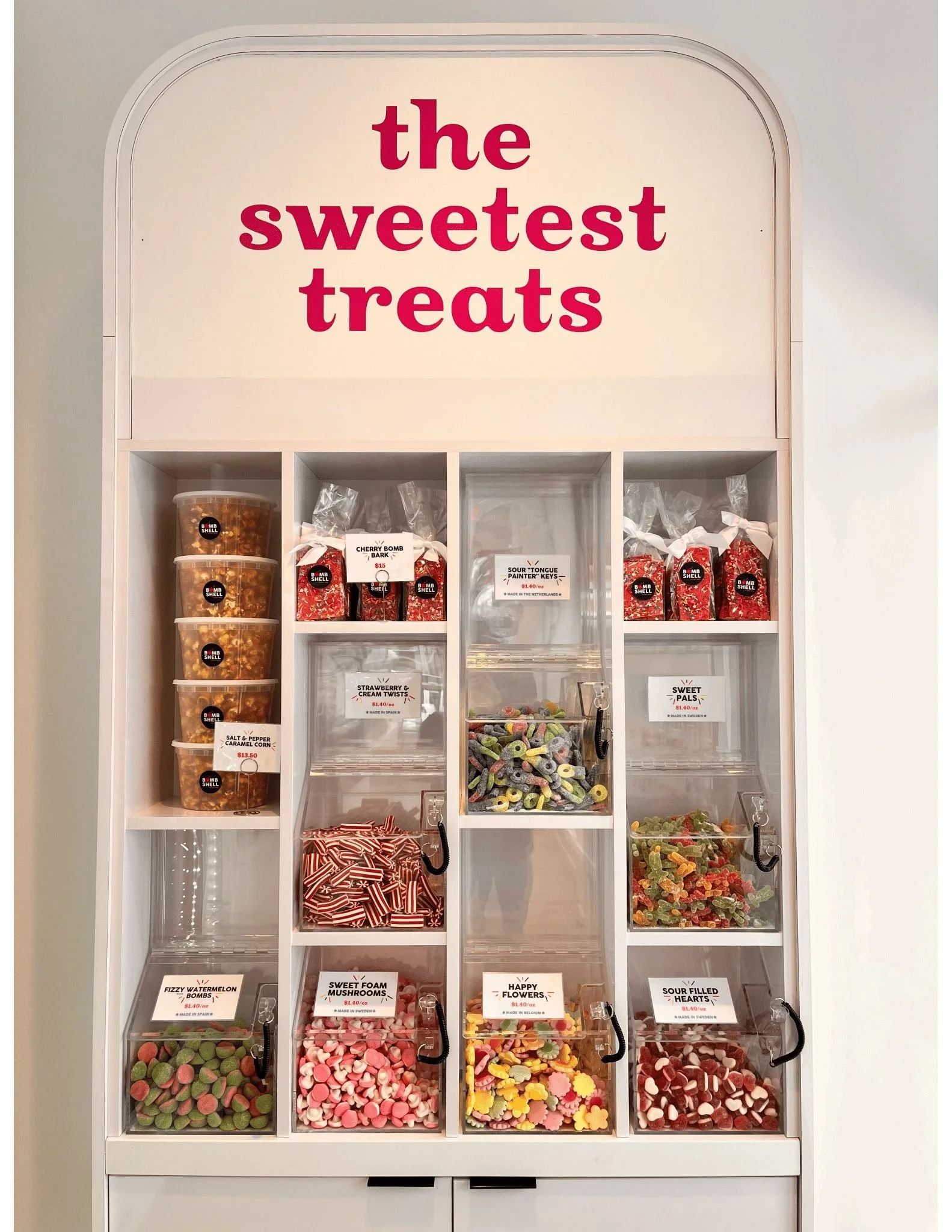 vanilla ice cream, funfetti cake, white chocolate fudge, strawberry sorbet, strawberry chocolate, bombshell sprinkles
